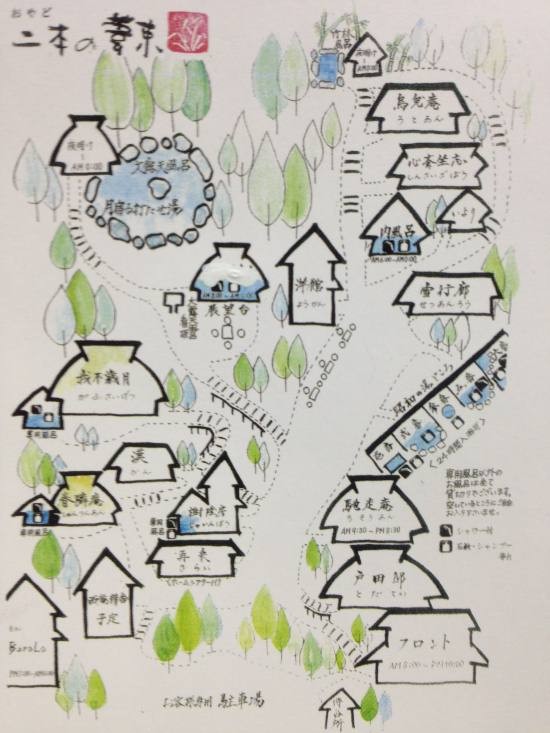 로비에 들어서자 여주인이 특유의 일본식 상냥함과 과장되어 보이는 ‘리액션’으로 손님을 맞는다. 료칸의 여주인을 오카미(Okami)라고 부른다. 웰컴 드링크와 간식을 먹으며 오카미의 설명을 듣는다. 이 료칸은 10개의 객실이 숲속에 독립된 방갈로식으로 자리잡고 있다.