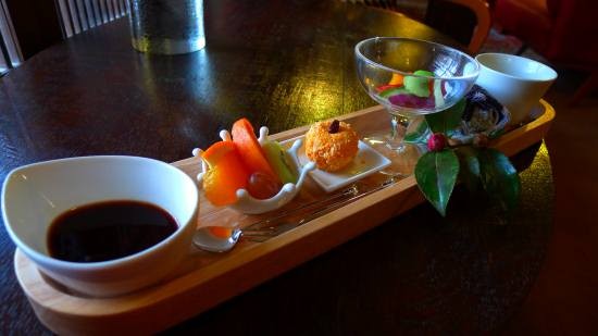 아침은 예약한 시간인 9시에 먹었다. 제철 채소와 무즙 나또가 신선하다. 연어구이와 감자 샐러드, 두부 부침, 온센다마고에 이어 밥과 국이 장아찌와 함께 나온다. 일본식 식사엔 장아찌가 제 맛이다.