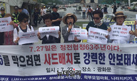 한국자유총연맹은 27일 오후 2시 광화문 세종로 공원 세종문화회관 우측 광장에서 정전협정 63주년 기념 ‘사드배치지지 결의대회’를 개최했다. 결의대회를 위해 전국 각지에서 올라온 자유총연맹 회원과 애국·보수 시민들이 모여 피켓을 들고 외쳤다. 김경재 한국자유총연맹 회장