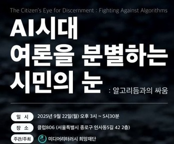 미디어리터러시희망재단(이사장: 고대영 전 KBS 사장)이 오는 22일 오후 3시, 서울 종로구 인사동 클럽806에서 'AI 시대, 여론을 분별하는 시민의 눈: 알고리듬과의 싸움' 세미나를 개최한다. 이번 세미나는 인공지능이 여론 형성과 정보 소비에 미치는 영향을 진단하