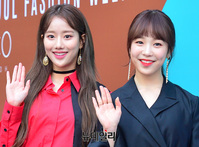 그룹 에이프릴 나은, 레이첼이 22일 오전 서울 동대문디자인플라자(DDP)에서 열린 '2018 F/W(가을·겨울)헤라서울패션위크(HERA Seoul Fashion Week)'에 참석해 포즈를 취하고 있다.이번 시즌 헤라서울패션위크는 37개의 국내 디자이너 브랜드와 2개
