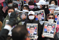 천암함 8주기를 앞둔 24일 오후 서울 중구 대한문 앞 광장에서 추도식에 앞서 순국영웅이 담긴 영정사진이 단상 위에 자리하고 있다. 앞서 이날 오후 2시부터 서울역 광장에는 박근혜 전 대통령 옥중투쟁을 지지하고, 천안함 8주기를 추모하고, 대통령 개헌안을 반대