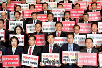 김성태 자유한국당 원내대표를 비롯한 의원들이 2일 오후 국회 로텐더홀에서 양승동 KBS 사장 후보자 임명을 반대하는 규탄대회를 하고 있다.