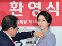 배현진 전 MBC 아나운서가 9일 오전 서울 여의도 중앙당사에서 열린 '영입인사 환영식'에 참석해 홍준표 대표에게 태극기 뱃지를 수여받고 있다. 배 전 아나운서는 지난 7일 MBC를 퇴사하고 자유한국당에 입당했다.이날 환영식에는 길환영 전 KBS 사장, 송언석 전 기획