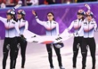 여자 계주 대표팀 심석희, 김아랑, 이유빈, 최민정, 김예진이 20일 오후 강원 강릉아이스아레나에서 열린 2018 평창동계올림픽 쇼트트랙 여자 3,000m 계주 결선에 금메달을 획득한 직후 태극기를 흔들고 있다. (사진=2018평창사진공동취재단)