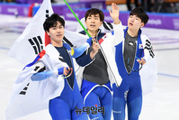 한국 이승훈, 김민석, 정재원 선수가 21일 오후 강원 강릉스피드스케이팅 경기장에서 열린 2018 평창동계올림픽 스피드스케이팅 남자 팀추월 결승전 직후 태극기를 흔들며 세리머니를 하고 있다. (사진=2018평창사진공동취재단)