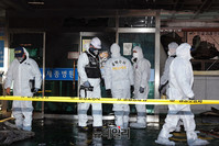 국립과학수사원이 26일 오후 경남 밀양시 세종병원 화재 현장을 감식하고 있다. 앞서 이날 오전 7시 30분께 밀양시 가곡동의 세종병원 1층에서 불이나 37명이 사망하고, 160여 명의 사상자가 발생했다. 29명의 사망자가 발생한 충북 제천 스포츠센터 화재가 발