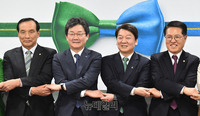 안철수 국민의당 대표와 유승민 바른정당 대표가 29일 오전 국회 의원회관에서 열린 통합추진위 제1차 확대회의에서 기념사진을 촬영하고 있다.