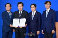 김부겸 행정안전부 장관, 이낙연 국무총리, 박상기 법무부 장관, 조국 청와대 민정수석 비서관(왼쪽부터)가 21일 오전 서울 종로구 정부서울청사 별관 국제회의장에서 '검·경 수사권 조정 합의문'에 서명한 직후 기념촬영을 하고 있다. 이날 발표한 검·경 수사권 조