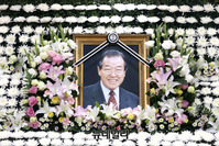 김종필 전 국무총리가 향년 92세로 별세한 23일 오후 서울 아산병원 장례식장에 마련된 빈소에 영정이 놓여 있다. 故 김종필 전 총리는 이날 아침 서울 자택에서 호흡곤란 증세를 일으켜 순천향병원 응급실로 이송돼 심폐소생술을 받았으나 회복하지 못하고 숨졌다.