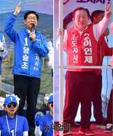 충남지사에 출마한 더불어민주당 양승조(왼쪽) 후보와 자유한국당 이인제 후보가 11일 충남 천안에서 각각 유세를 이어가고 있다.양승조 후보는 이날 오후 천안시 갑·병 재보궐 선거에 출마한 이규희, 윤일규 후보와 함께 천안중앙시장을 찾아 지지를 호소했다. 이인제