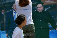 대학생겨레하나 회원들이 15일 오전 서울광장에서 열린 6.15 18주년기념, 평화통일박람회에서 판문점회담 당시 문재인 대통령과 북한 김정은이 도보다리를 걷는 이미지의 대형 현수막을 설치하고 있다. 이들은 이 현수막을 광화문역에 설치하려고 했지만 서울교통공사가