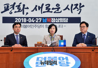 남북정상회담이 무사히 개최되면서 야 3당 '드루킹 특검' 요구로 수세에 몰렸던 더불어민주당이 이슈 돌파구를 찾아 화색이 도는 모양새다. 추미애 대표, 우원식 원내대표 등 민주당 지도부는 27일 오전 국회에서 남북정상회담 TV 생중계를 지켜보기 위해 한 자리에 모였다.