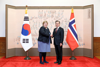 문재인 대통령이 15일 에르나 솔베르그 노르웨이 총리와 청와대에서 정상회담을 통해 한반도 정세 및 양국 간 실질협력 강화 방안에 대한 의견을 교환했다. 고민정 청와대 부대변인은 이날 브리핑을 통해 "문 대통령이 북한의 올림픽 참가를 통해 조성된 남북대화가 북미 대화로