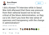 최근 한반도 전문가인 브루스 클링너 美헤리티지 재단 연구원이 “한국 언론과 인터뷰를 했는데 검열 삭제를 당했다”는 트윗을 올려 논란이 일고 있다.