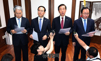 여야 교섭단체 원내대표들이 18일 오후 국회 의장실에서 '드루킹 특검법안' 세부내용의 합의문을 발표하고 있다.이날 여야는 특검 수사 준비기간은 20일, 수사기간은 60일에 1회 한해 30일 연장이 가능하도록 합의했다. 이를 위한 본회의를 19일 열어 처리할 예정이다.