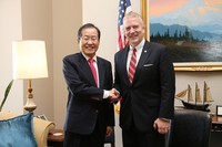 방미 중인 자유한국당 홍준표 대표가 26일(현지시간) 문재인 대통령에게 일 대 일 안보 영수회담을 제의했다. 홍준표 대표는 이날 기자들과 만나 "안보 영수 회담을 제의하겠다"며 "미국 조야의 분위기와 우리가 취득한 북핵에 대한 대처 방안을 대통령과 만나 상의를 하는 것