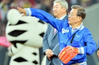 文대통령, 파란 점퍼 입고 시구…임종석 동행
