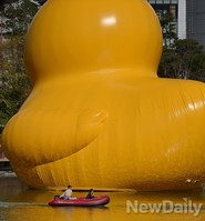 [포토] 러버덕 옆을 지나가는 고무보트, 러버덕 크기가!