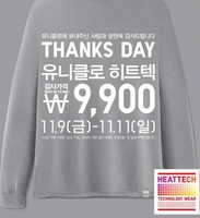 유니클로는 9일부터 11일까지 할인 이벤트를 실시한다.이번 유니클로 할인 이벤트 기간에는 최고의 인기 상품 '히트텍'을 50%까지 할인해 판매한다. 기간 한정 이벤트의 일환으로 9900원의 가격으로 판매하는 것. 히트택은 올해로 10주년을 맞이한 유니클로의 대표적인 인
