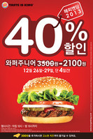 버거킹이 연말을 맞아 세일 행사를 시작한다. 버거킹은 26일부터 오는 29일까지 나흘 동안 와퍼주니어 단품을 기존 3,500원 에서 40% 할인된 가격인 2,100원으로 판매하는 파격 프로모션을 진행한다고 밝혔다. 행사 기간동안 오전 10시부터 오후 10시까지 진행되는