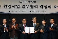 LG전자는 15일 대우건설과 국내외 환경사업 협력을 위한 업무협약(MOU)을 체결했다고 밝혔다. 양사는 14일 저녁 서울 소공동 웨스틴 조선호텔에서 LG전자 경영지원부문장 이영하 사장과 대우건설 서종욱 사장 등이 참석한 가운데 협약을 맺었다. 포괄적 업무협력으로 국내