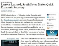 "미국이 경제 위기 탈출 모범국 한국에서 배워야 할 교훈은 무엇일까?" 뉴욕 타임스(NYT)가 6일(현지시간) 한국을 경제 위기 탈출의 모범 사례로 소개했다. 한국이 지난 1997년 국제통화기금(IMF) 구제금융 위기에 이어 최근 금융위기에서도 신속히 벗어나면서 미국
