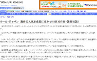 "해외시장에서 칭찬 받는 것에 만족하는 일본과 대조적으로 아시아 각지에서 존재감을 늘리고 있는 것은 한국이다" 요미우리 신문은 30일 사설을 통해 세계 속 '일본 붐'을 국가의 경제성장과 직결시키지 못하는 현실을 지적하며, 한국의 글로벌 마케팅을 배워야 한다고 역설했다