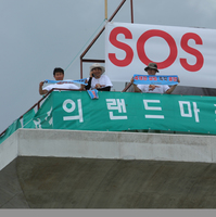 4대강사업을 반대하던 환경단체 3명이 22일 새벽 경기도 여주군 4대강 사업 제3공구인 이포대교 옆 이포보 구조물에 올라가 4대강 사업 중단을 요구하며 점거농성을 벌이고 있다.여주 이포보 점거농성자들이 두레박을 내려 물을 길어올리고 있다. ⓒ 뉴데일리 이들은 20m 높