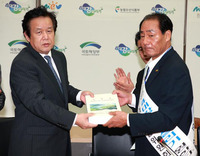 "해상왕국의 중심 백제, ‘4대강’으로 부활시켜주세요"심명필 4대강추진본부장(왼쪽)에게 부여군개발위원회 김용태 위원장이 군민 탄원서를 전달하고 있다. ⓒ 뉴데일리 부여 주민들이 4대강 사업과 금강종합개발사업을 빨리 완수해 달라며 12000명의 서명을 받은 탄원서를 들고
