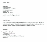 지난 17일(이하 현지시간) 아이폰 4세대(4G)로 보이는 스마트폰이 공개된 가운데 애플이 공식 서한을 통해 입수한 제품의 반환을 공식 요청한 것으로 알려졌다.아이폰 4G를 입수했던 IT 전문매체 ‘기즈모도’는 19일 애플로부터 온 공식 서한을 공개했다. 이 서한은 애