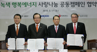 한국전력공사(KEPCO, 이하 한전)는 17일 '녹색‧행복에너지 사랑나눔' 공동캠페인 시행을 위한 협약을 체결했다고 밝혔다.에너지복지사업의 일환으로 한전 남서울본부에서 마련된 이번 캠페인은 김용구 국회의원과 한국에너지재단, 비씨카드(주)가 공동으로 내달 부터 9월까지