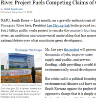 "4대강 살리기 사업은 2013년 5년 임기가 끝난 뒤 이명박 대통령의 명성을 드높일 수 있을지 결정할 것이며, 나아가 그의 후임자 결정에까지 영향을 미칠 수 있다(That will make him either famous or infamous long after hi