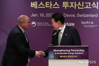 다보스포럼 참석을 위해 스위스를 방문 중인 윤석열 대통령이 풍력터빈 제조 세계 1위 기업인 베스타스(VESTAS) 투자신고식에 참석했다. 덴마크 기업인 베스타스는 한국에 3억달러(약 3703억5000만원) 투자를 신고했다.윤 대통령은 18일(현지시각) 스위스 다보스에서