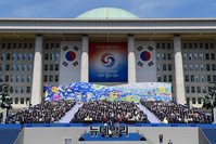윤석열 대통령의 취임식이 10일 '다시 대한민국! 새로운 국민의 나라'라는 슬로건으로 서울 여의도 국회의사당 잔디마당에서 열렸다.전·현직 정상급 외빈을 비롯해 5대 그룹 총수와 경제6단체장 등 재계, 20인의 국민희망대표, 2만4000석 규모의 국민 초청석