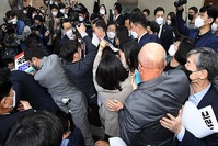 국민의힘이 2일 더불어민주당이 '검수완박'(검찰 수사권 완전박탈) 관련 검찰청법 개정안을 통과시키는 과정에서 박병석 국회의장실 앞에서 일어난 물리적 충돌과 관련해 박 의장의 사과와 사퇴를 촉구했다.국민의힘 여성의원들은 이날 국회에서 기자회견을 열고 "민주당의 입법독재를