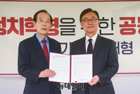 국민의힘 대선주자로 나섰다 1차 경선에서 컷오프된 장기표 전 후보가 최재형 예비후보를 공식 지지하고 나섰다.최 후보와 장 전 후보는 4일 오전 서울 여의도 대하빌딩 최 후보 캠프 사무실에서 '정치혁명을 위한 공동선언' 기자회견을 열고 "새로운 정치문화 창출을 위해 함께