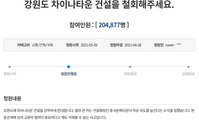 강원도가 추진 중인 '한중문화타운' 건설에 반대하는 청와대 청원에 이틀 만에 청와대 답변 기준인 20만 명 이상이 동의했다.31일 오후 3시 현재 청와대 청원게시판의 '강원도 차이나타운 건설을 철회해 주세요'라는 글은 20만4877명 동의를 받았다. 한중문화타운은 춘천