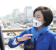 공식 선거운동 이틀째인 26일 오전, 거리 유세에 나선 더불어민주당 박영선 서울시장 후보가 구멍난 파란색 운동화(사진)를 신고 있는 모습이 포착됐다.이날 박 후보는 오른쪽 이음새 부분에 구멍이 난 낡은 운동화를 신고 서대문구 북가좌초등학교 앞에서 녹색어머니회 회원들과