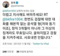 진중권 전 동양대 교수가 16일 법무부 검사징계위원회의 '윤석열 검찰총장 정직 2개월' 처분과 관련해 조국 전 법무부장관과 박범계 더불어민주당 의원의 트윗을 인용하며 윤 총장에게 "더럽고 치사해도 버텨달라"고 당부했다.진 전 교수는 이날 페이스북에 글을 올려 "정직 2
