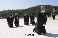 김종인 미래통합당 비상대책위원장이 19일 광주 5·18민주묘역을 찾아 "민주 영령과 광주시민 앞에 용서를 구한다"며 무릎을 꿇었다. 김은혜 통합당 비대위 대변인과 김선동 사무총장 등도 함께 참배했다. 보수정당 지도부가 5·18 민주묘역을 찾아 무릎을 꿇은 것은