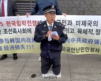 "중공(중국 공산당) 정부는 조선족 사회와 한국 정부에 사과하라. 정신적·육체적·경제적 피해를 받은 조선족 가족과 한국 국민에게 경제적으로 손해를 배상하라."중국 공안 출신인 조선족 난민 이규호 씨가 6·25전쟁 75주년인 25일 서울 중구 주한중국대사관 앞에서 기자회