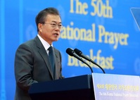 문재인 대통령이 8일 제50주년 대한민국 국가조찬기도회에서 유화적 대북정책에 대한 지지를 호소했다.문 대통령은 '예수 사랑'을 언급하면서 "포용하고 화합하는 사랑을 실천하는 여러분이 한반도의 미래를 위해 기도해달라"고 강조했다. 김정은 정권과의 화합을 목표로 하는 대북