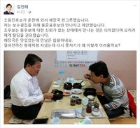 자유한국당 김진태 의원이 새누리당 조원진 후보와 단일화 논의를 위해 춘천에서 만났지만 입장차를 좁히지 못했다고 전했다.김 의원은 27일 자신의 페이스북을 통해 "조원진 후보가 춘천에 와서 해장국 한그릇 했다"며 "조 후보는 홍준표 후보에 대한 신뢰가 없는 상태에서 만나