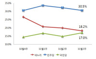 129석 집권여당인 새누리당의 정당 지지율이 원내 3당 중 3위로 추락할 위기에 놓인 가운데, 친박계 지도부는 비박계를 향해 "해당 행위"라며 전면 반격에 나서는 등 보수(保守)의 위기가 끝을 보이지 않고 있다.여론조사 전문기관 〈리얼미터〉가 매일경제 〈레이더P〉의 의
