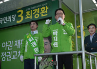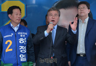 유세차량 올라 마이크 잡고 지원유세 열중… 광주와는 딴판