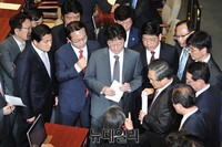 여야가 엉성하게 이뤄놓은 공무원연금 개혁안이 그나마도 막판 진통으로 성사 여부가 불투명한 와중에, 이에 아랑곳하지 않고 본회의장에서 인사 청탁에 골몰하는 국회의원들의 모습이 〈뉴데일리〉 카메라에 잡혔다.국회가 어설픈 연금 관련 합의로 미래 세대의 부담을 가중시켰다는 비