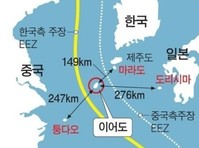 높아지는 '이어도' 波高이어도는 수심 4.6m의 수중 암초이기에 국제법상 그 자체로는 영해나 EEZ 등 관할수역 설정이 불가능하다. 양국의 영토 기점으로부터 중간 지점을 기준으로 관할권을 행사한다는 ‘중간선 원칙’에 의하면 이어도는 우리 관할권에 속한다. 그러나 우리