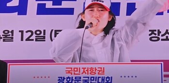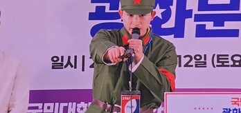 12일 오후 서울시 종로구 이승만광장에서 열린 '국민저항권 국민대회'에서 북한 인민군 군복 차림으로 연단에 선 자유통일당 관계자가 "헌법재판소의 8:0 만장일치 결정은 공산당 선언"이라고 비판했다.그는 "작금의 현실은 집집마다 북한 지도자의 사진을 걸고 충성을 바쳐야