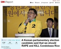 서울 노원갑 민주통합당 김용민 후보의 성폭행 발언이 결국 국제적 망신거리로 전락했다.지난 5일 CNN 독자 참여 사이트인 ‘iReport(ireport.cnn.com)’에 ‘A Korean parliamentary election candidate said that w